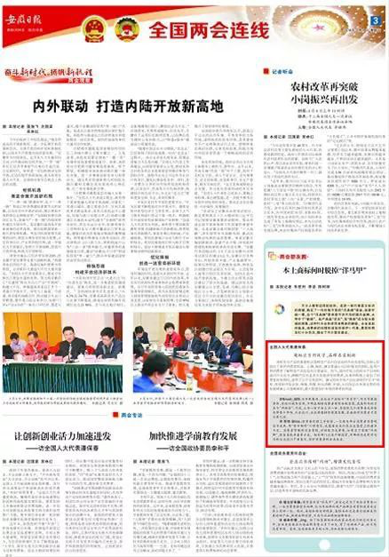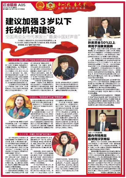 ◆ 3月8日,《江淮晨報》刊發(fā)對潘保春董事長(cháng)采訪(fǎng)——《全國人大代表潘保春:國內市場(chǎng)商品應使用漢字商標》。