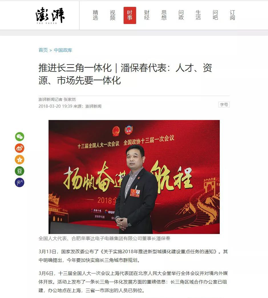 全國人大代表、合肥榮事達電子電器集團有限公司董事長(cháng)潘保春尤為關(guān)注長(cháng)三角一體化的發(fā)展。日前,澎湃新聞(www.thepaper.cn)對潘保春進(jìn)行專(zhuān)訪(fǎng)。