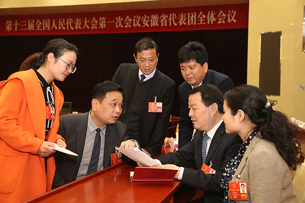 潘保春與其他全國人大代表討論 合肥榮事達電子電器集團有限公司供圖