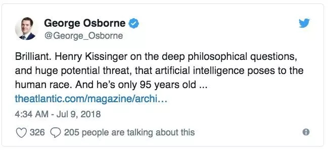 基辛格警告稱(chēng),我們正處于“一場(chǎng)全面的技術(shù)革命中,這場(chǎng)革命的后果我們沒(méi)有完全考慮,其高潮可能是一個(gè)依賴(lài)數據和算法驅動(dòng)、不受倫理或哲學(xué)規范支配的機器的世界!