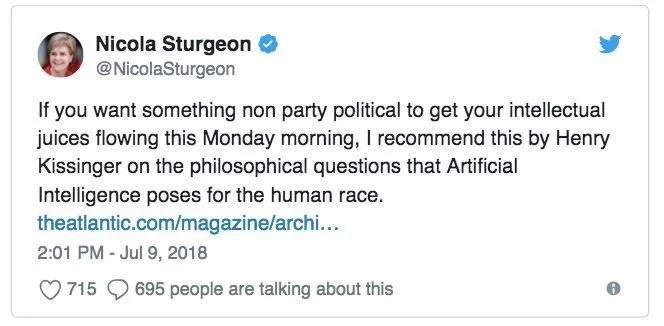 蘇格蘭國家黨主席Nicola Sturgeon在Twitter上推薦基辛格的文章