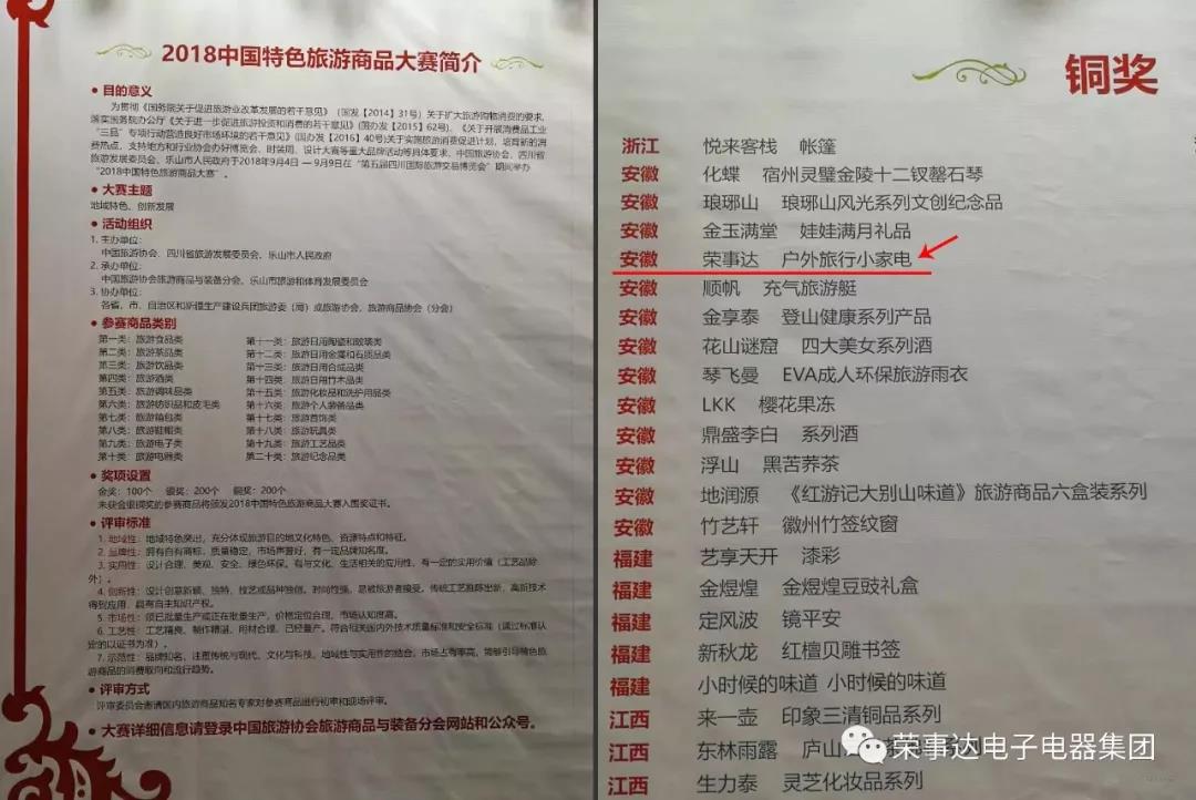 經(jīng)過(guò)層層篩選,榮事達戶(hù)外旅行產(chǎn)品從來(lái)自全國31個(gè)省市區的8萬(wàn)余件參賽商品中脫穎而出,斬獲大賽銅獎。同時(shí),在此屆評選活動(dòng)中,榮事達電子電器集團也是合肥賽區唯一獲獎單位。