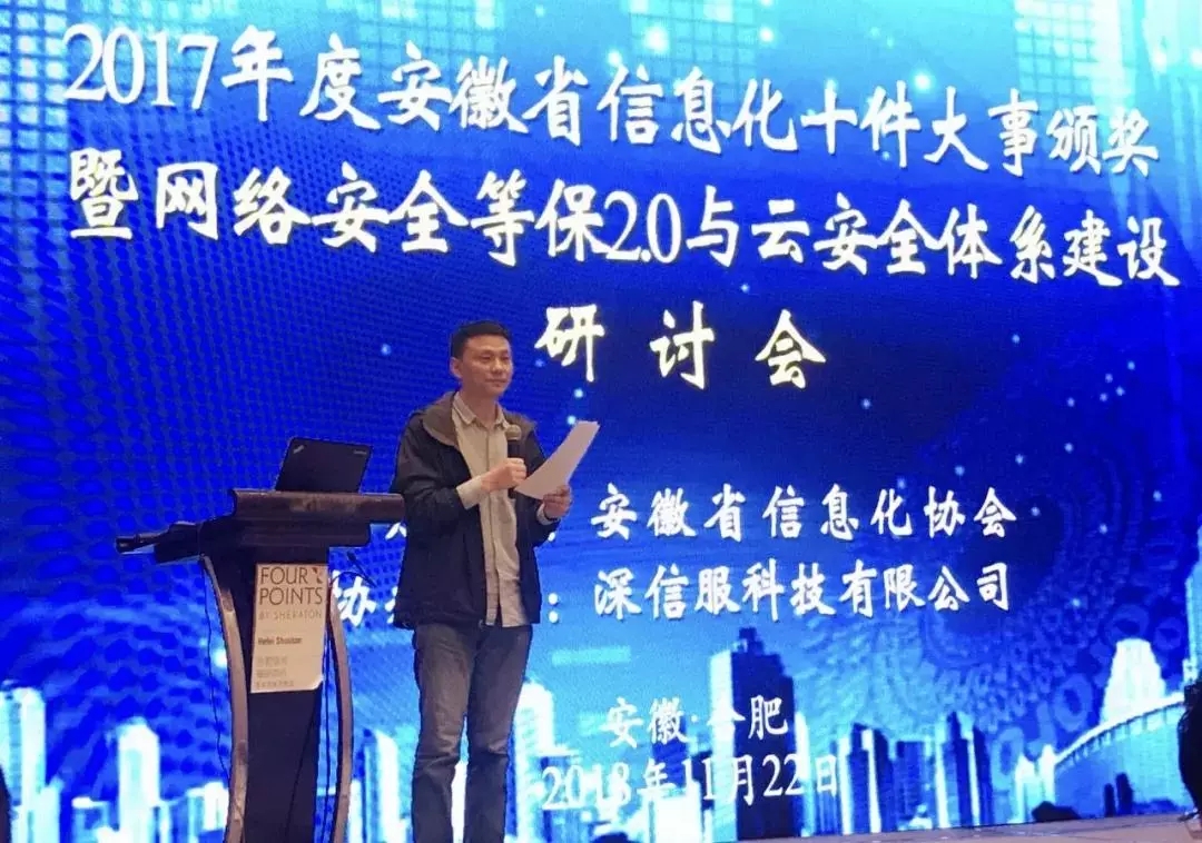 11月22日,由安徽省信息化協(xié)會(huì )主辦的“2017年度安徽省信息化十件大事頒獎暨網(wǎng)絡(luò )安全等保2.0與云安全體系建設研討會(huì )”在合肥順利召開(kāi)。